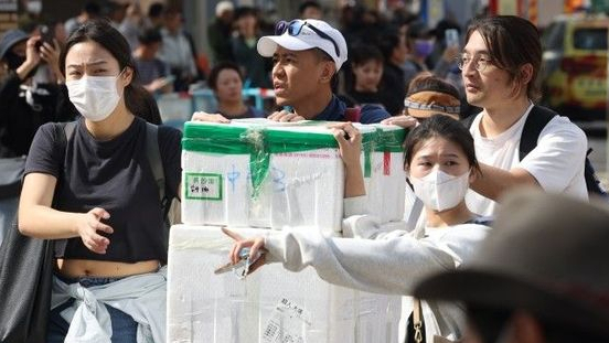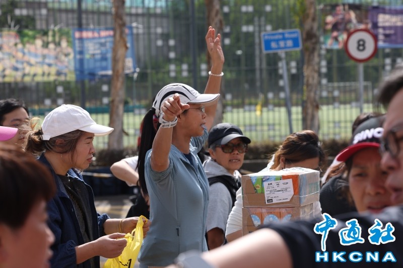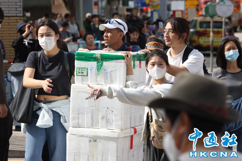 11月27日,香港大埔宏福苑五级大火后,社区力量迅速集结。志愿者们推着堆满矿泉水的购物车穿梭现场,泡沫箱上“长沙湾”字样见证跨区援助。(香港中通社记者 邓梓杰 摄)