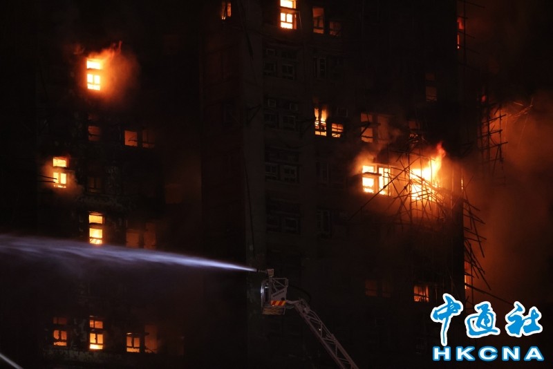 11月26日,香港大埔宏福苑发生五级火警,宏昌阁外墙棚架率先起火,其后蔓延至宏泰阁及宏新阁等大厦。(香港中通社记者 谢光磊 摄)