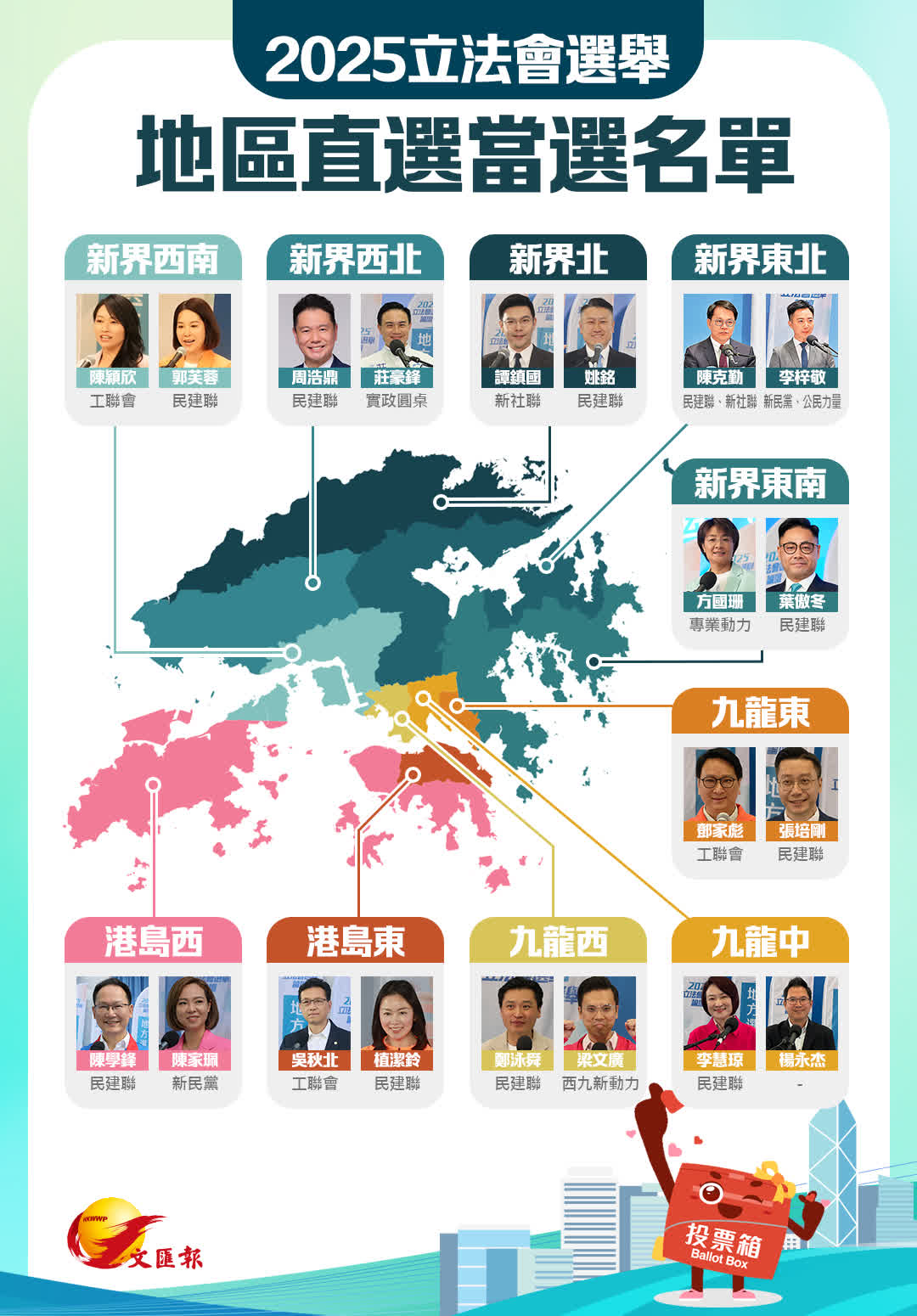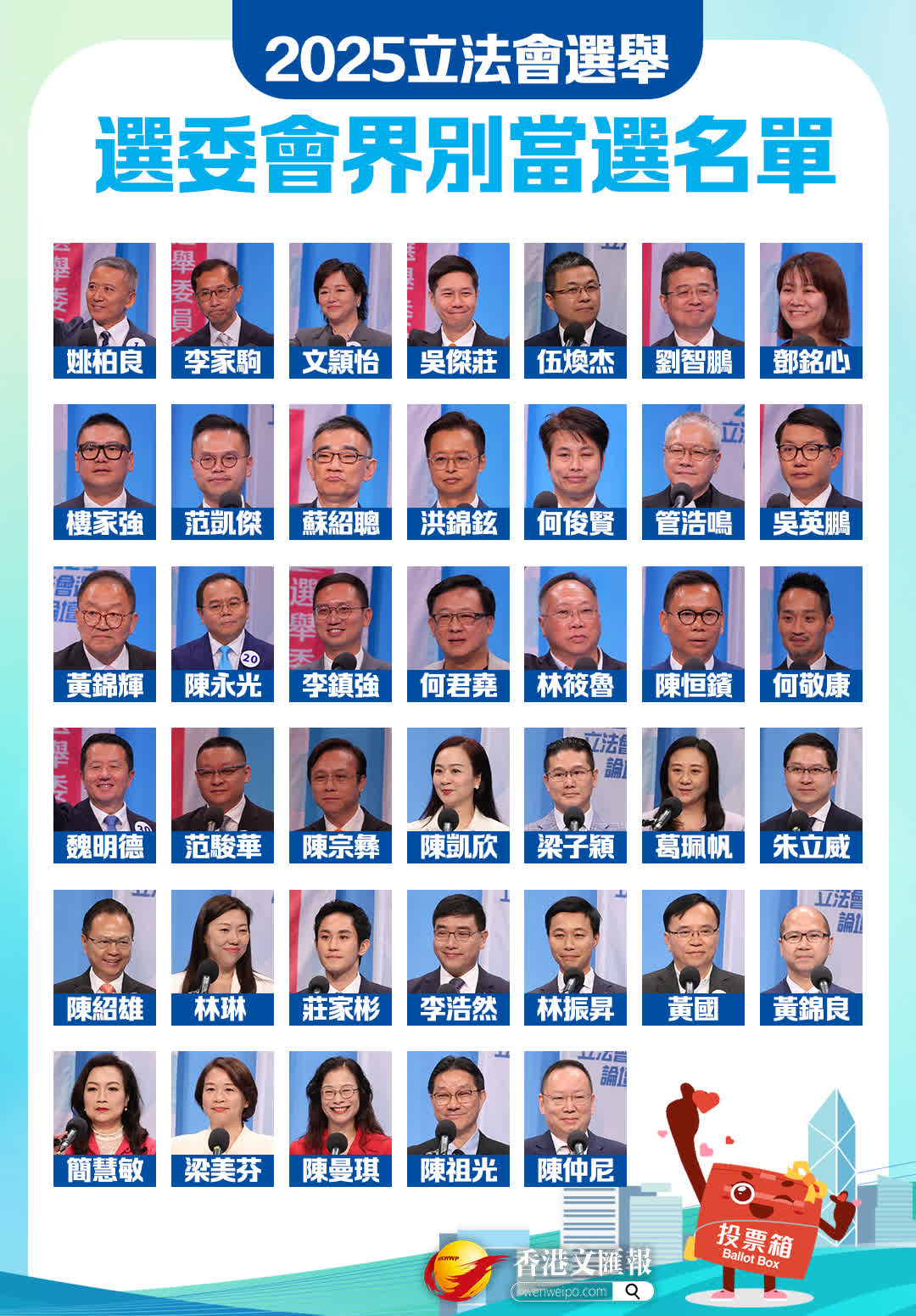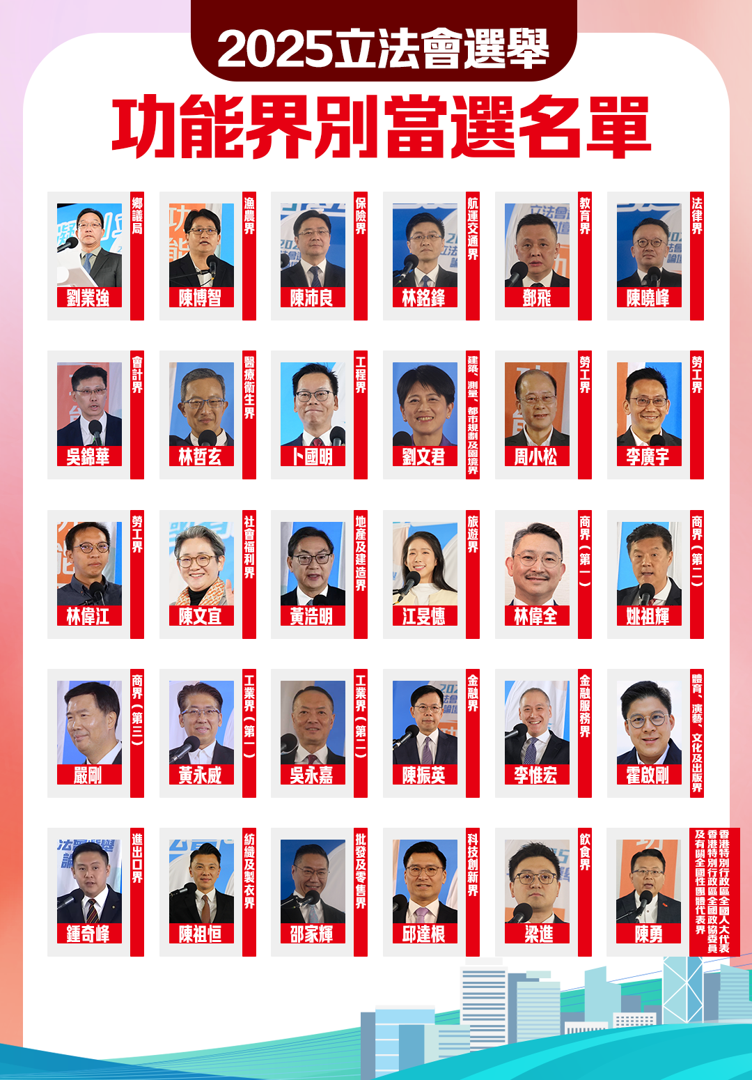 连任的议员分别为:陈颖欣、周浩鼎、陈克勤、李梓敬、邓家彪、陈学锋、陈家佩、吴秋北、梁文广、郑泳舜、李慧琼、杨永杰;刘业强、陈沛良、邓飞、林哲玄、周小松、严刚、吴永嘉、陈振英、李惟宏、霍启刚、陈祖恒、邵家辉、邱达根、陈勇;姚柏良、吴杰庄、刘智鹏、何俊贤、管浩鸣、黄锦辉、陈永光、李镇强、何君尧、林筱鲁、陈恒镔、何敬康、陈凯欣、梁子颖、葛佩帆、陈绍雄、林琳、李浩然、林振升、黄国、简慧敏、梁美芬、陈曼琪、陈仲尼。