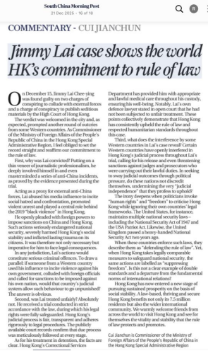 外交部驻港公署特派员崔建春12月21日在《南华早报》发表题为《关于黎智英案,你应该知道这些》的署名文章,从三个问答解画黎智英案,批驳某些西方国家公然干预香港司法,是赤裸裸的虚伪双标。