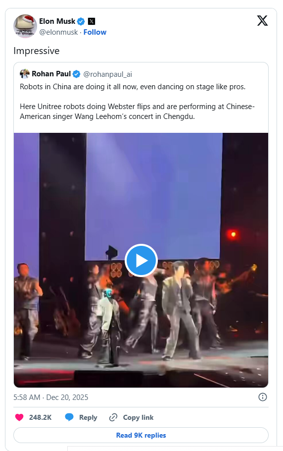 香港新闻网12月22日电(编辑 丘志彬)近日,美国企业家、特斯拉与太空探索技术公司(SpaceX)创办人马斯克在社交平台上,转发了一段机器人在演唱会舞台上表演的视频,再次掀起国际舆论对中国人形机器人的讨论热度。