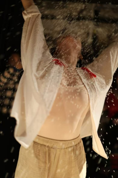 当她再次站起时,白裙已被水与米粒染成半透明,红线在湿发间蜿蜒如血。黄羚以一个极度舒展却充满力量的动作,将双手高举过头,像巫女完成通灵后的献祭,又像凤凰破水重生。灯光骤亮,掌声才终于爆发。