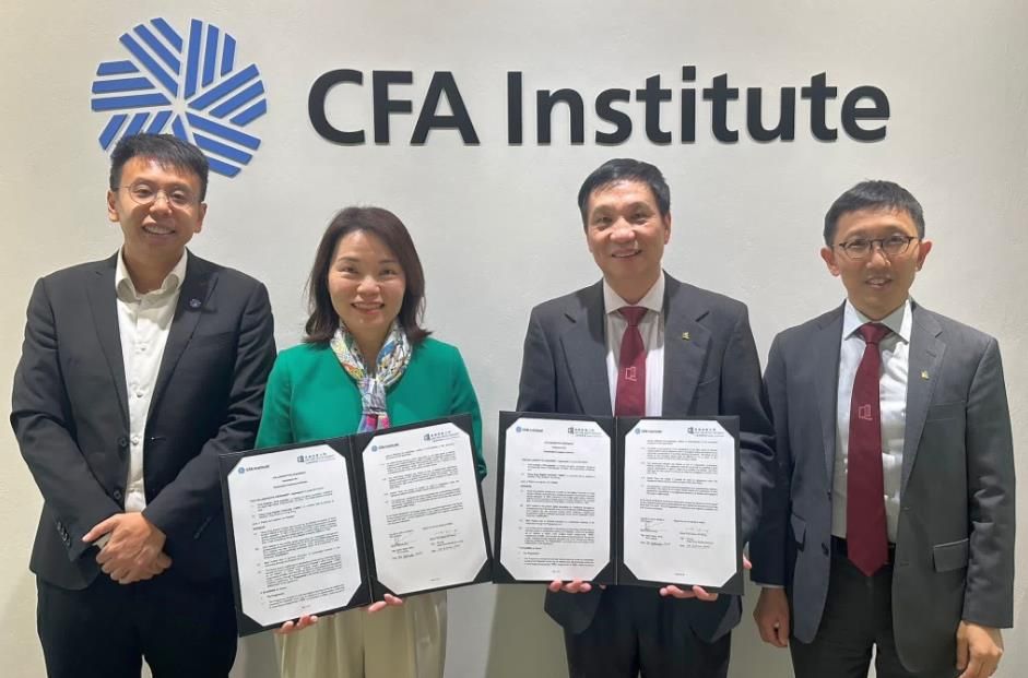 香港浸会大学与CFA协会签署合作备忘录。张晗(右二)、侯翠琴(左二)。