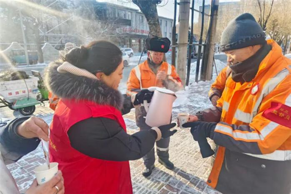 社区将阅览室设置为“环卫工人休息处”,配齐热水、纸巾等基础保障物资,为户外作业的环卫工人打造集休憩、补给于一体的暖心空间。同时组建志愿服务队,深入辖区主次干道、背街小巷,为清扫积雪作业的环卫工人送上热饮,以贴心举措驱散严寒、传递温暖。