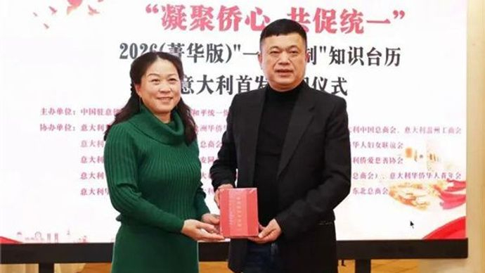 1月2日,受“一国两制”知识台历编委会主任吕英杰委托,意大利中国和平统一促进会在罗马向阳庄园举办“凝聚侨心·共促统一2026版‘一国两制’”知识台历意大利首发赠阅仪式。中国驻意大利使馆公参过琳、领侨处负责人牟俊宏、领事李冰清以及当地侨团代表出席活动。