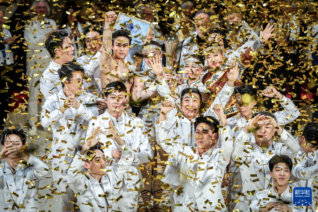 1月12日,在匈牙利首都布达佩斯,中国杂技团演员在颁奖仪式上庆祝。