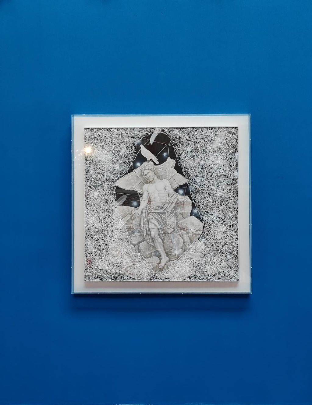 在《文艺复兴三杰》中,周艺文并非直接解读达·芬奇、拉斐尔、米开朗基罗,而是以羽毛与红线为载体,对历史进行回应与重构。周艺文认为,羽毛、线不仅是造型手段,更是生命的轨迹与情绪的复调,串联起历史与当代。他以羽毛、红线与大师进行精神对话,旨在打破媒介与时空界限,构建一个跨文化、跨媒介共生的艺术生世界。