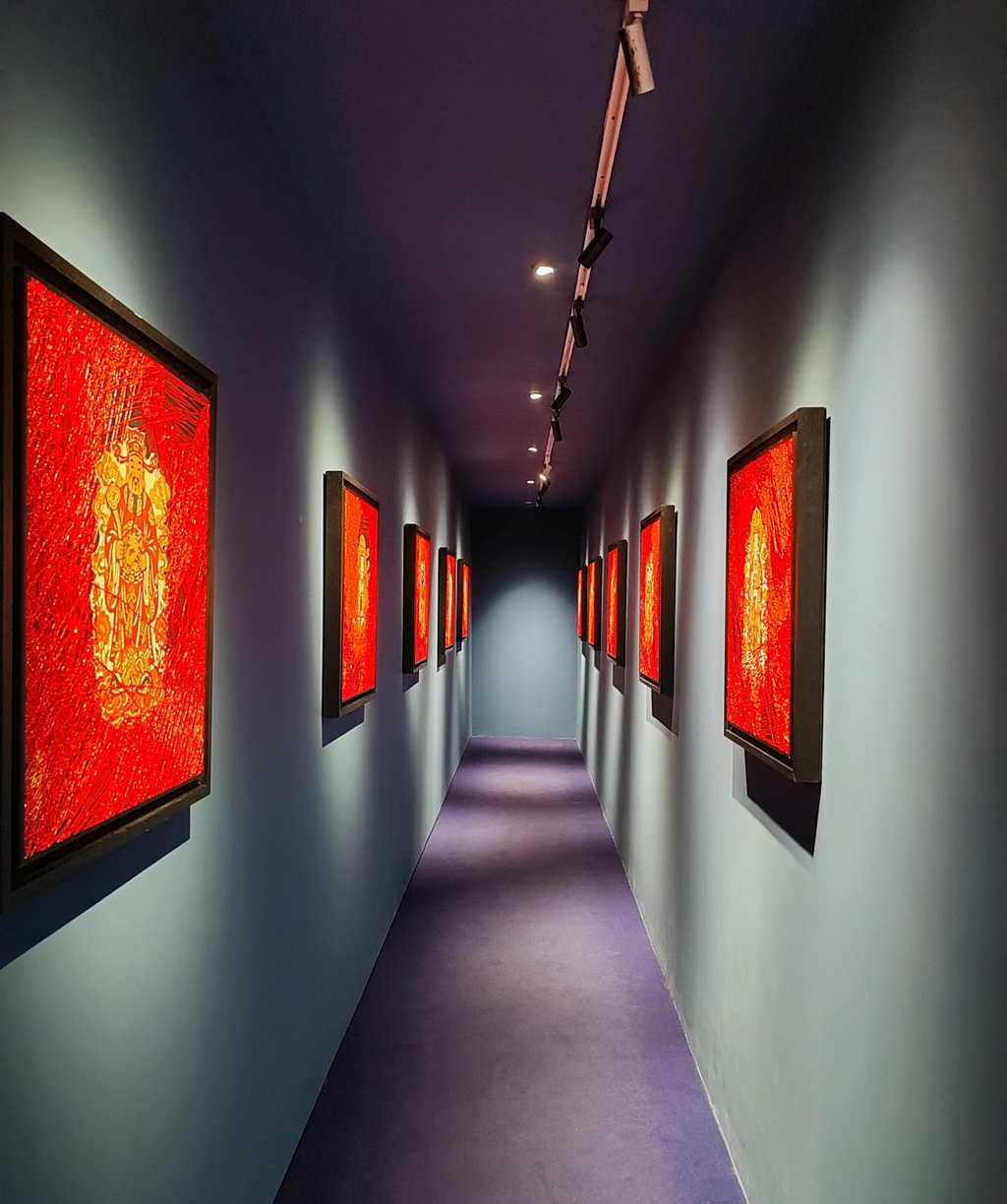 周艺文在《诸神来了:财神》中,以中国非遗剪纸为原型,通过当代艺术的“线的哲学”对传统财神造型进行解构与重构。剪纸固有的轮廓线条被提炼与强化,转化为更具表现力与精神性的独立语言。这种创作超越了对民俗符号的简单转译,而是将传统形式从原有文化语境中剥离,通过线条的纯粹力量,构建出一个既熟悉又陌生的当代“新神像”。这深刻体现了其“新文艺复兴”理念:主动将本土文化遗产视为转化与再编码的“历史材料”,并在当代视觉语法中为其赋予全新的观念内涵与启蒙角色,实现传统的创造性再生。