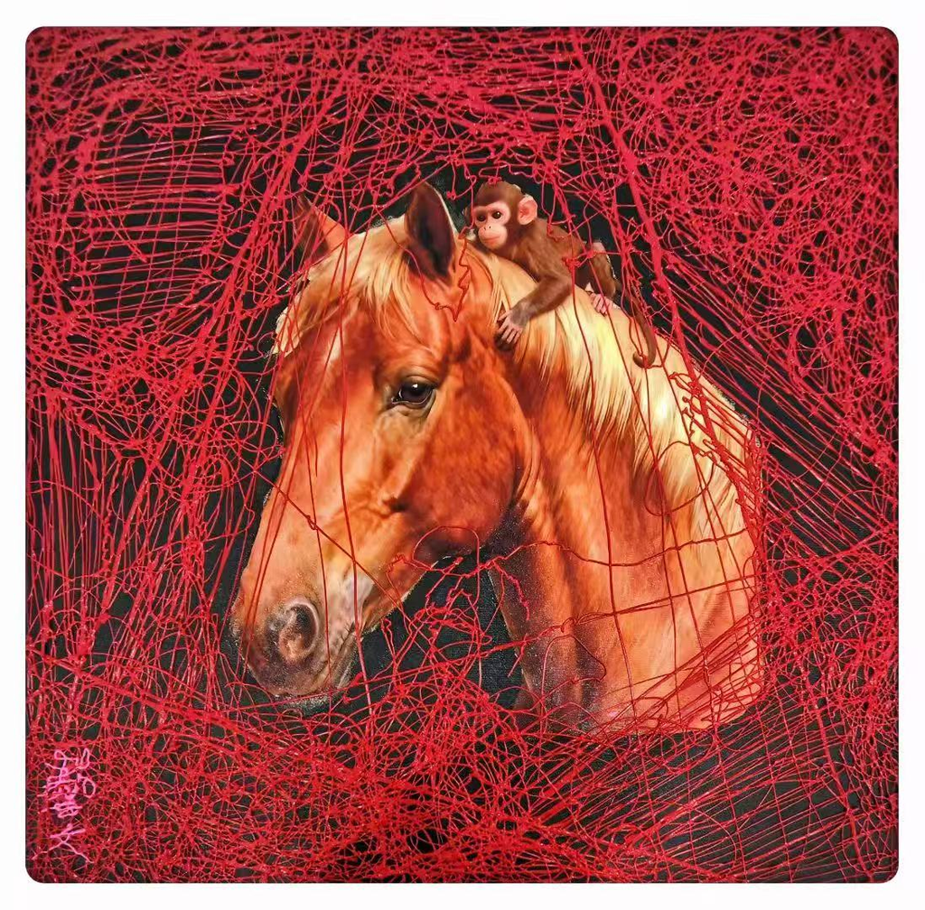 周艺文的《马上封侯》以当代艺术手法,对传统吉祥符号进行解构与重构。艺术家通过其独特的“线的哲学”——一种充满表现力与生命律动的线性语言,不仅塑造了红马与灵猴超现实的共生形态,更赋予线条独立的精神性能量,使之成为情感与观念的直述。此举超越了对象征寓意的简单转换,是一种主动的后现代艺术方法论的自由表达。