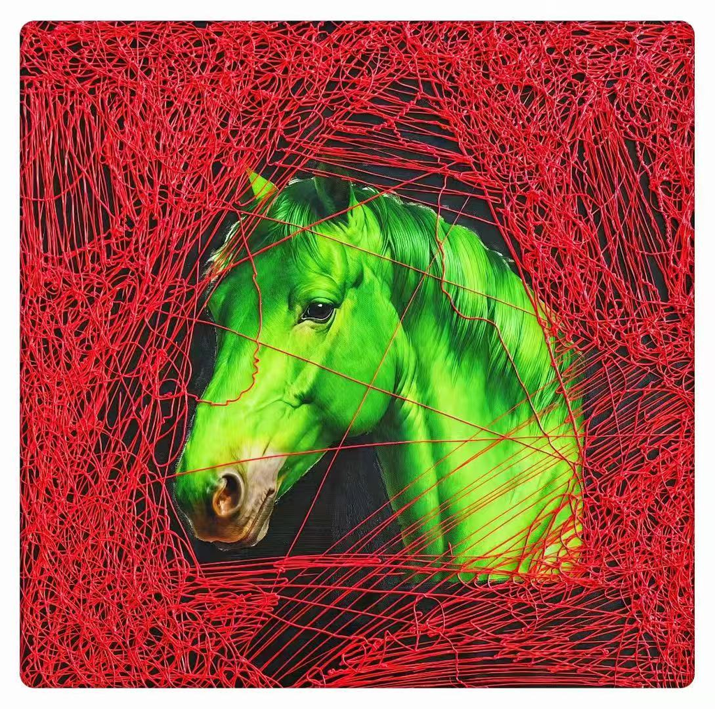 周艺文的《绿马》以“线的哲学”构建当代寓言。他选择非自然的绿色塑造马匹,配以醒目的红色线条,此举本身就是一种对视觉惯性与传统美学体系的解构与挑战。这些充满张力、富于生命律动的红线,不仅是造型的轮廓,更构成了独立的叙事与精神脉络。这种创作方式,正是其“新文艺复兴”核心理念的体现:艺术家将形式(色彩)与语言(线条)本身作为核心材料,超越对现实或历史符号的直接引用,主动构建了一套新的、富有隐喻性的视觉语法,以此探索艺术语言在当代语境下的纯粹表达与新的启蒙可能。