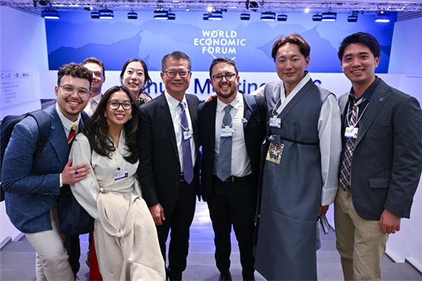 陈茂波(右四)出席世界经济论坛2026年年会的欢迎酒会。