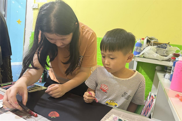 策展人史莉莲(中间站立者)在深圳心连星早期教育训练有限公司教自闭症孩子画画。