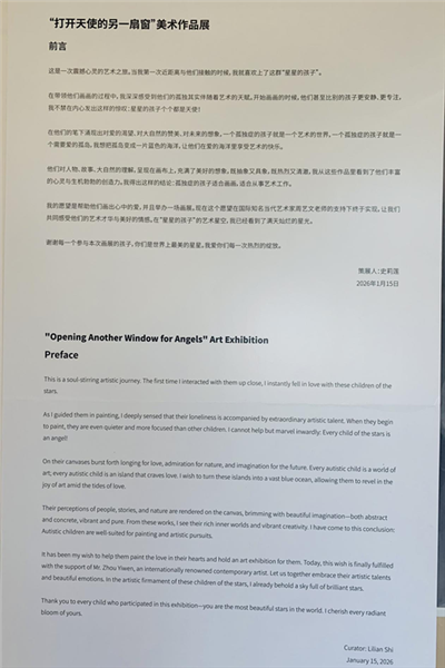 史莉莲在展览前言中提到,这是一次震撼心灵的艺术之旅。当她第一次近距离与他们接触的时候,她就喜欢上了这群“星星的孩子”。在带领他们画画的过程中,她深深感受到他们的孤独其实伴随着艺术的天赋。开始画画的时候,他们甚至比别的孩子更安静、更专注,我不禁在内心发出这样的惊叹:星星的孩子个个都是天使!