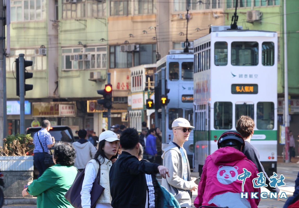 图为电车吸引街上的市民拍照。