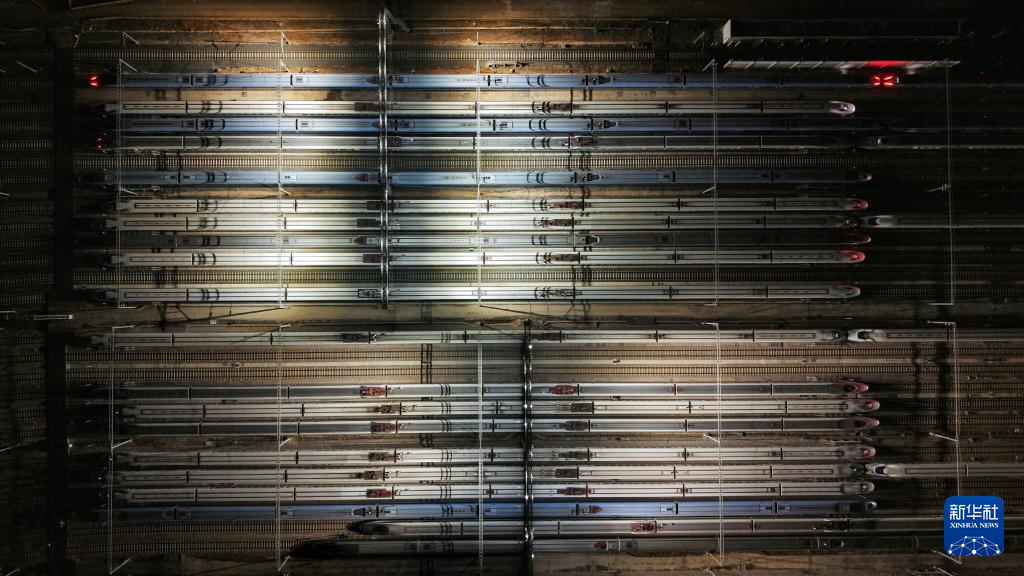这是1月25日凌晨在昆明车辆段昆明南动车运用所拍摄的动车组列车(无人机照片)。