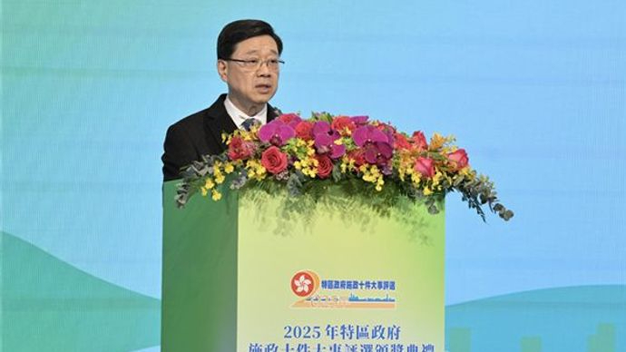香港新闻社1月30日报道 “2025年特区政府施政十件大事评选”颁奖典礼29日在香港会展中心举行。香港特区行政长官李家超出席并致辞。
