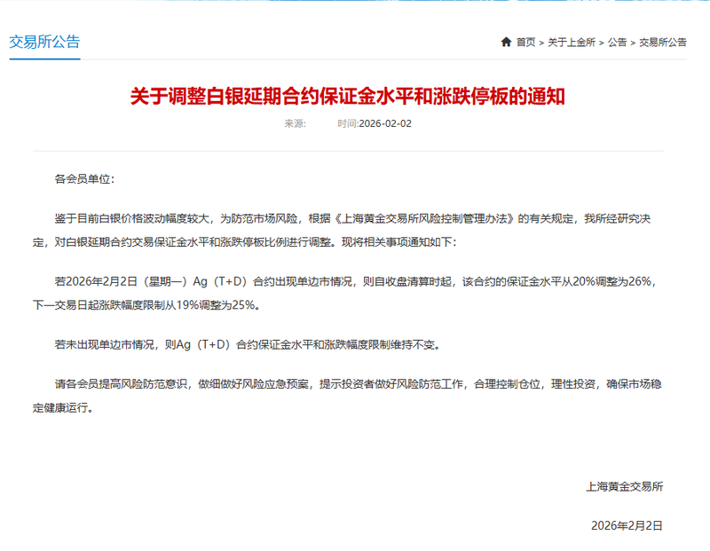 据人民财讯2月2日电 上海黄金交易所消息,鉴于目前白银价格波动幅度较大,为防范市场风险,根据《上海黄金交易所风险控制管理办法》的有关规定,我所经研究决定,对白银延期合约交易保证金水平和涨跌停板比例进行调整。现将相关事项通知如下:若2026年2月2日(星期一)Ag(T+D)合约出现单边市情况,则自收盘清算时起,该合约的保证金水平从20%调整为26%,下一交易日起涨跌幅度限制从19%调整为25%。若未出现单边市情况,则Ag(T+D)合约保证金水平和涨跌幅度限制维持不变。