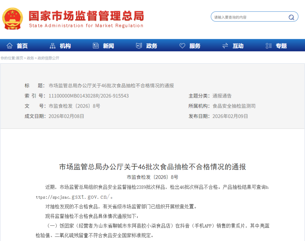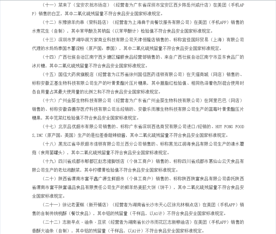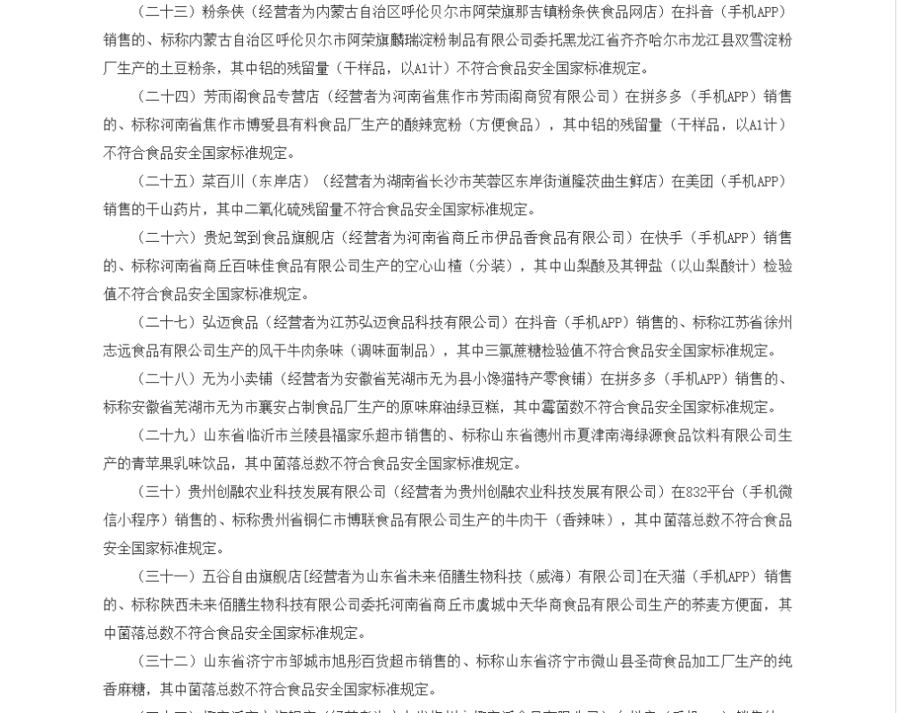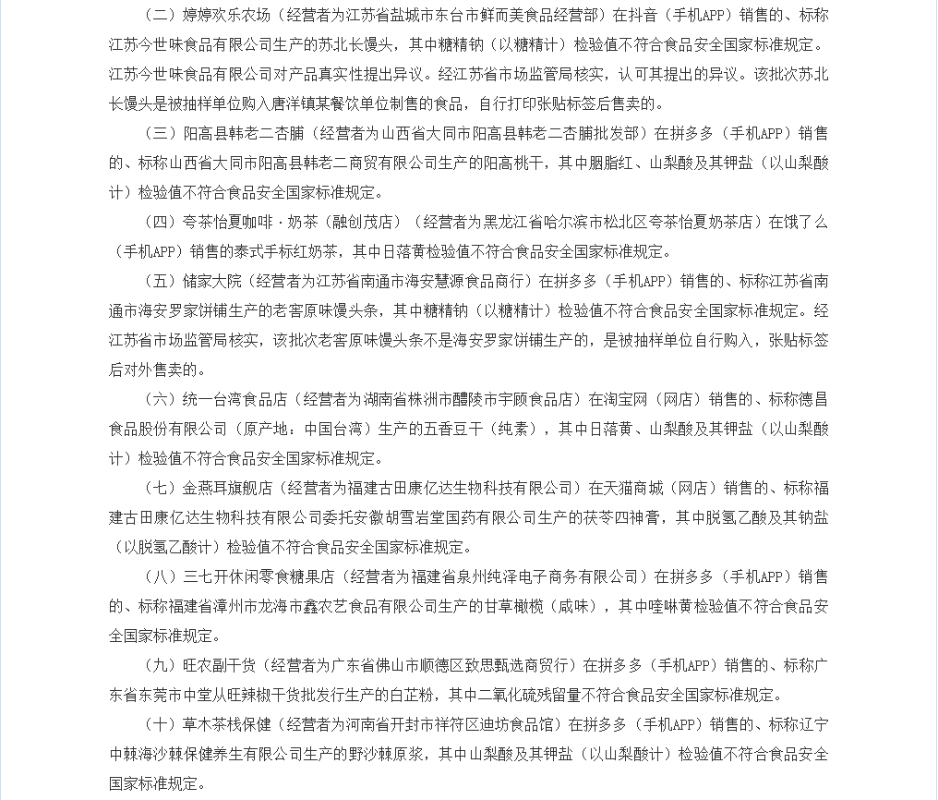 中国国家市场监管总局日前公布,近期抽检中46批次食品不合格,覆盖抖音、拼多多、美团、淘宝等主流电商平台。